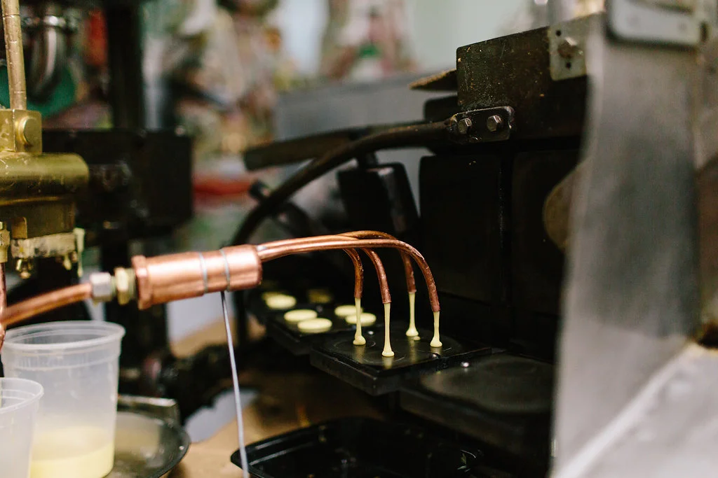 When I discovered that the only place in the U.S. that still makes fortune cookies by hand was in my backyard, I had to visit The Golden Gate Fortune Cookie Factory. To form the cookies, tiny spigots dispense batter onto cast iron molds, creating a pancake shape. Once the cookies are “baked,” two women fold the warm wafers around a paper fortune, then pinch them in the middle before they cool and become too brittle to bend. Each woman turns out 1,000 cookies an hour.