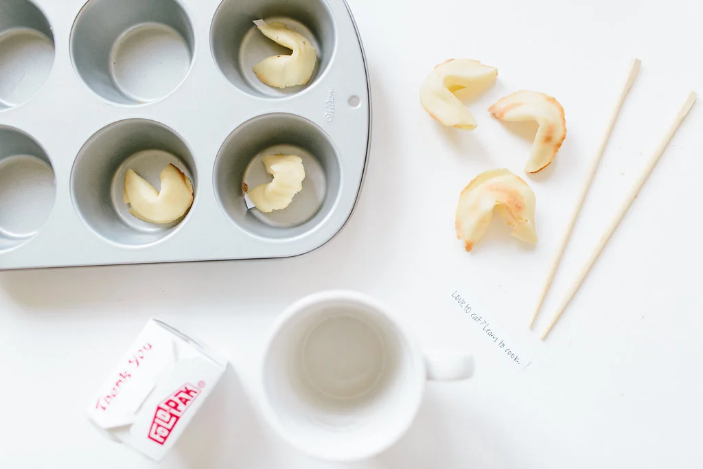 Homemade fortune cookies let you be the fortuneteller for the night. If you’re up for a little experiment, try making them from scratch. They’re a bit finicky and much easier if you have a friend or sous chef to help. But if you just want to add some zazzle, buy your fortune cookies, then dip them in melted chocolate and pretty sprinkles (skip to step #12 below). I won’t tell.