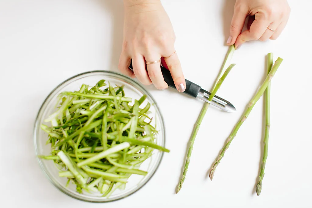 - Hold the bottom of one asparagus spear, and using a vegetable peeler, slide away from you toward the tip of the asparagus to create a long thin shaving. Place shaving in a bowl.