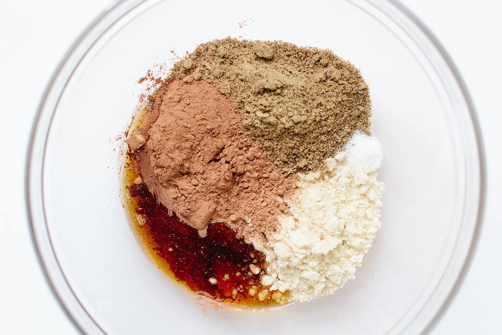 - Put maple syrup, coconut oil, flax seed, almond flour, cacao powder in a bowl and mix until combined.