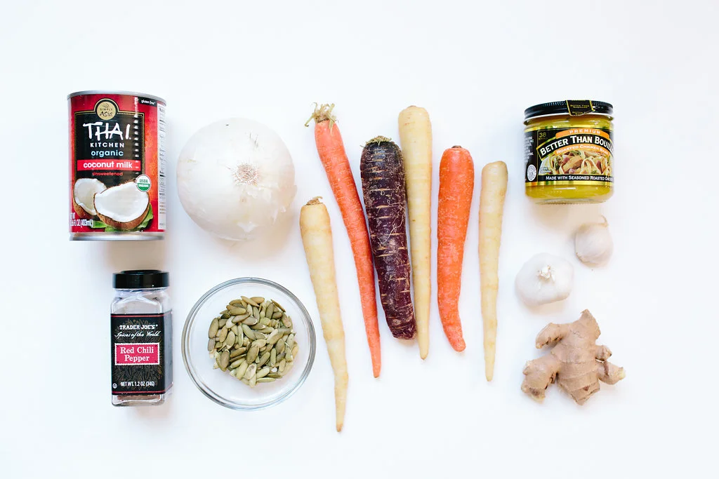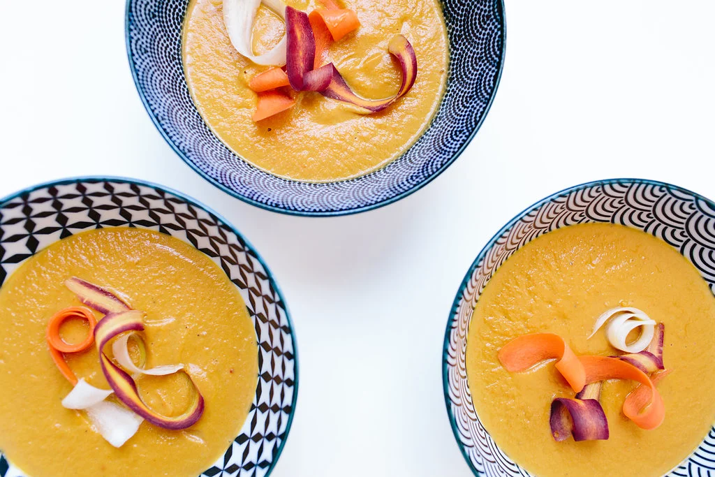 This soup is an excellent party dish because it’s show-stoppingly beautiful, it comes together in a flash, and it can be made ahead. Serve it hot or cold. I used rainbow carrots, but if you use all orange carrots the soup will be an even brighter, more vibrant orange.