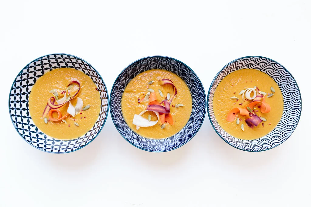 Ladle soup into bowls and garnish with pumpkin seeds, sprinkle of feta, squeeze of lime juice, and top with coiled carrots.