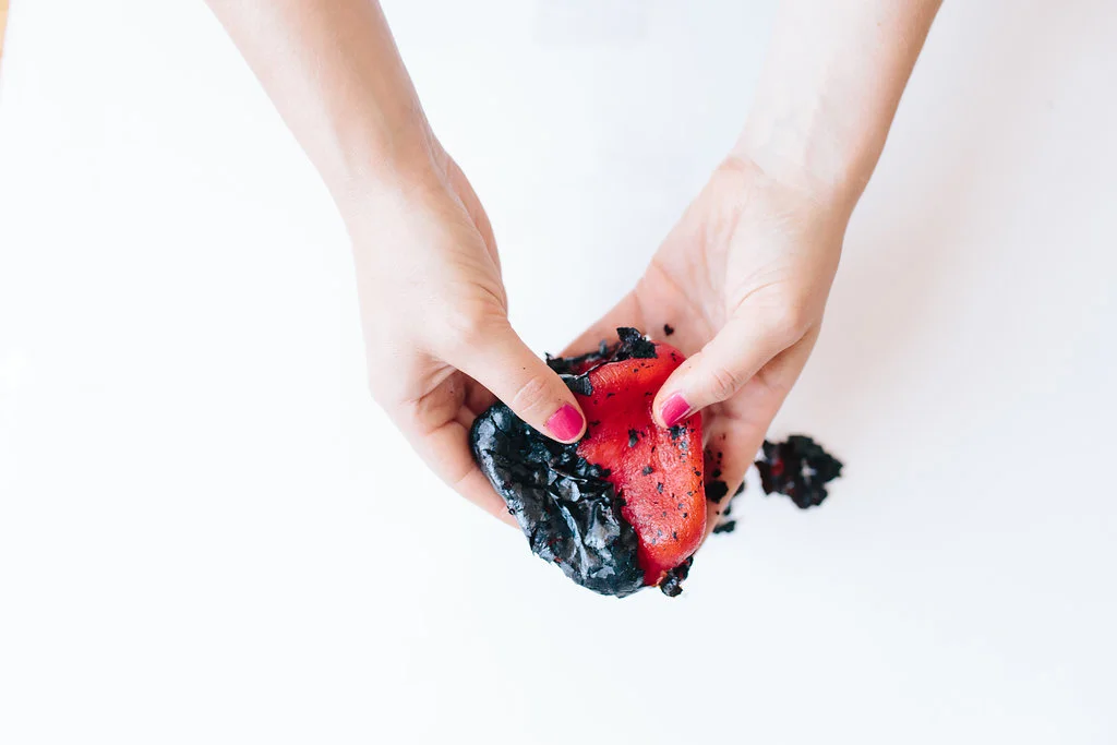 - Remove pepper (it may still be hot so be careful!) and rub the black charred skin off, revealing the soft roasted pepper underneath. Do not rinse the pepper (WHY? #2).
